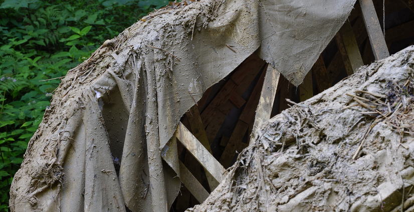 神戸六甲ミーツ・アート2024 beyondで制作した作品。六甲山をつくり出した地球のプレートの動きや断層といった大地を動かすエネルギーから着想し、地殻変動を行う力を生物のように表現した。見慣れた目の前の景色も、地の底でゆっくりと確実に私たちの世界を動かし続け、世界は流動的なものだと言える。六甲山は中央構造線を境にした大地の動きによって土地が隆起して形成された山で、今も1年に1センチ程度のスピードで隆起が続いている。この作品では、地球の内側からのエネルギーが地表を変化させていく様子を種がひらく状態に重ねて表現し、すべては変化していくこと、変化によって既にあったものが壊れるのと同時に別の可能性がひらくことを表現した。 作品は、木材や布などで構成した2つの構造体を重ね、縄と紐を巻きつけ、六甲山の土と粘土を被せた。六甲山の自然を映し出すように、重力や空気、風雨や様々な生物によって1つの力が分化していく状態を作品として表現している。