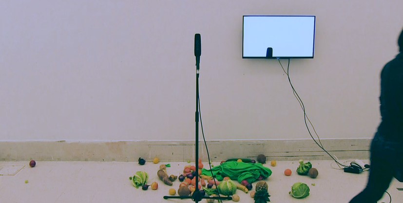 野菜、果物、緑の服、モニター、マイク、パフォーマンス